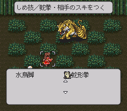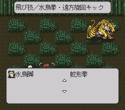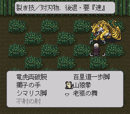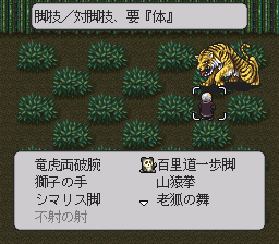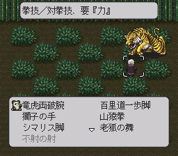 All three disciples’ namesakes study under a single master in Journey to the West. As the final disciple, Wùjìng undergoes the least development from training, and is the weakest of the three. Accordingly, his victories must often come from outsmarting his opponents, rather than overwhelming them. This is reflected in Live A Live; Yun has no remarkable stats, save for his considerable IQ. Further, his moves are the plainest of the chapter’s four playable characters, being simply 突き (tsuki, thrust) and けり (keri, kick).